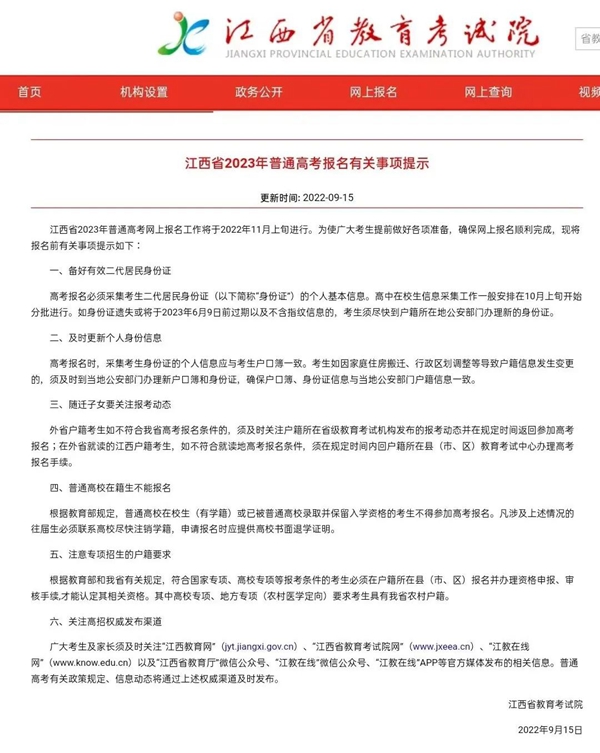 江西省教育考試院發(fā)布2023年高考報(bào)名重要提示! 11月上旬進(jìn)行!